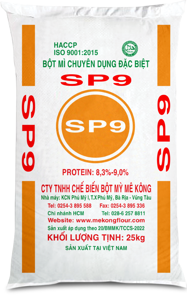 Bột mì SP9 được dùng làm bánh bông lan cao cấp, bông lan cuốn, bánh Custard, bánh Chiffon, bánh nướng Cup Cake, các loại bánh xốp và bánh quy giòn. Bột mì SP9 có màu trắng ngà, mịn, kích thước hạt đồng đều, có mùi thơm tự nhiên của loại lúa mì mềm cao cấp và tro thấp, thích hợp làm các loại bánh cake high ratio, bánh sữa trứng, bánh chiffon, bánh nướng nhỏ, bánh quy và bánh cracker.